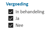 Het is mogelijk om het dashboard te filteren op basis van de keuzeselectie voor ‘Vergoeding’. U kunt klikken op de keuzemogelijkheden ‘Ja’, ‘Nee’ of ‘In behandeling’ om de vergoedingsstatus te bekijken.
